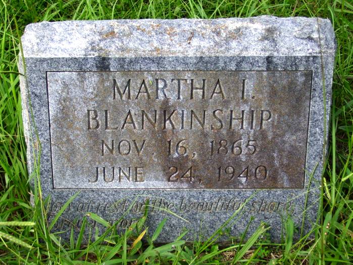 | Martha I. Blankinship | 11-16-1865 | 6-24-1940 | "Now at rest on the beautiful shore forever more" | PB & LH | |