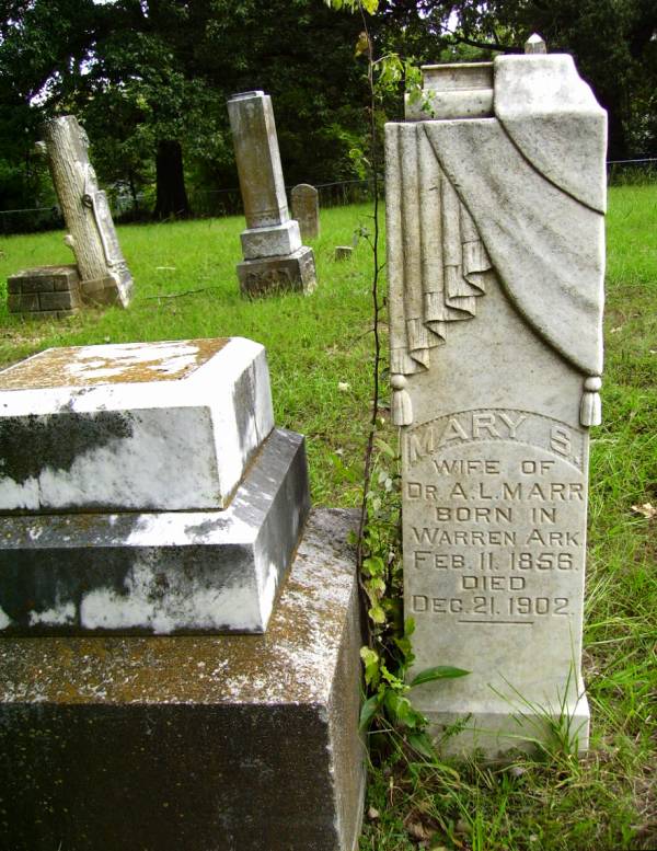 | Mary S. Marr | 2-11-1856 | 12-21-1902 | "WIFE OF DR. A. L. MARR" "BORN IN WARREN ARK." | DP & LH | |