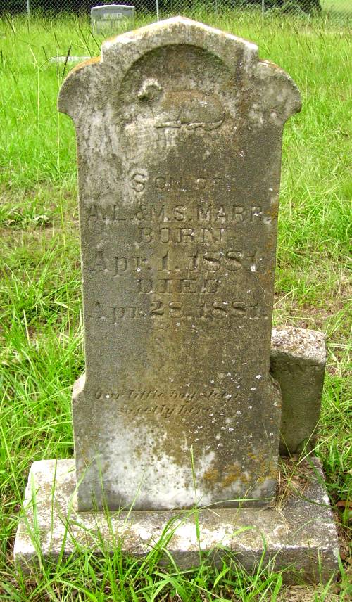 | Son Marr | 4-1-1881 | 4-28-1881 | "SON OF A. L. & M. S. MARR "Our little boy sleeps sweetly here" [their other children are John & Mary] | DP & LH | |