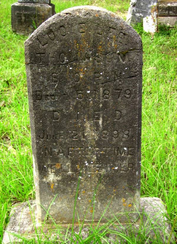| Lucie Lee Thomason | 12-5-1879 | 6-21-1893?8? | "IN AFTER TIME WE'LL MEET HER" [d/o B. F. & Martha Thomason] | DP & LH | |