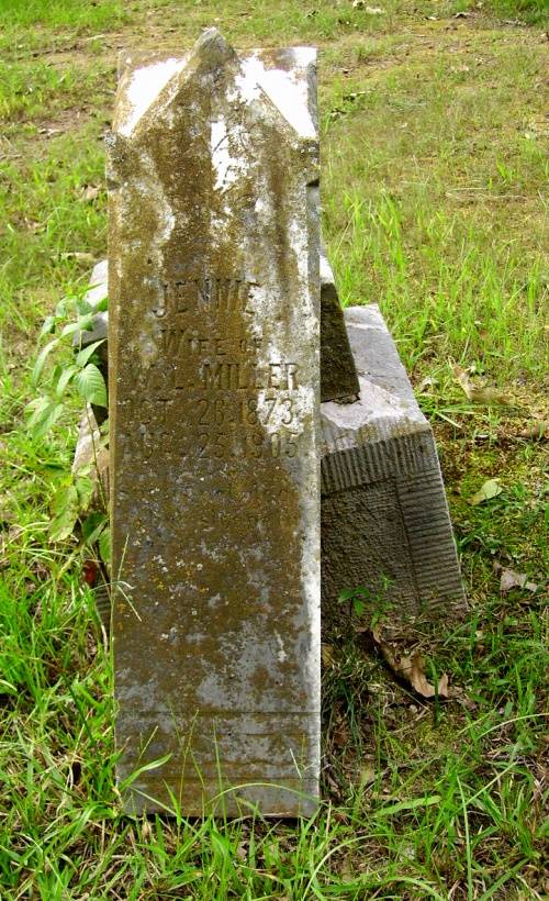 | Jennie Miller | 10-26-1873 | 8-25-1905 | "WIFE OF W. L. [William Lawrence] MILLER" [Full name: Jane Bell "Jennie" Handly Miller] | DP & LH | |