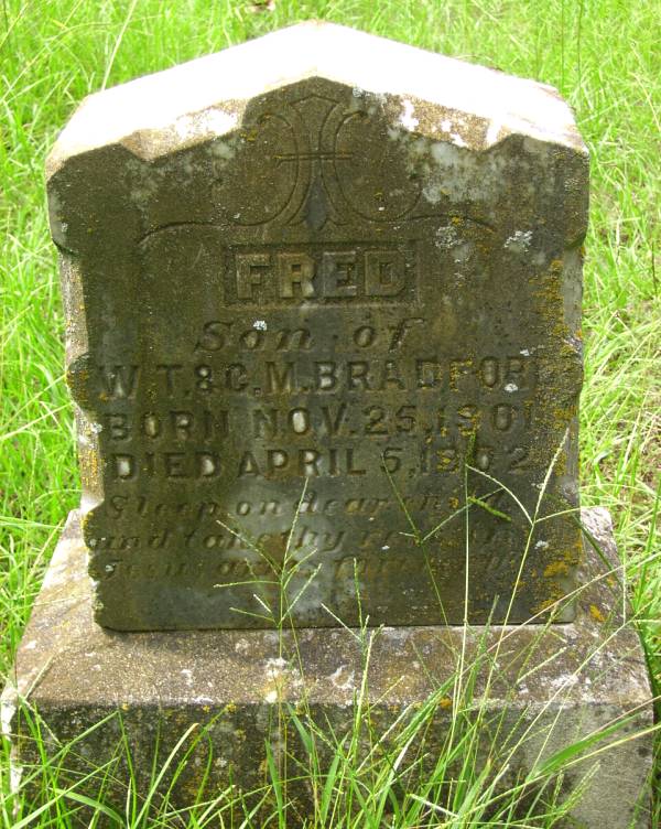 | Fred Bradford | 11-25-1901 | 4-5-1902 | "Son of W.T. & C.M. BRADFORD" "Sleep on dear child and take they rest in Jesus arms forever blest" | DP & LH | |