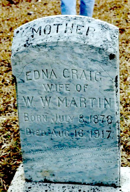 | Martin, Edna Craig | July 8, 1878 | Aug 16, 1917 | "MOTHER" "WIFE OF W. W. MARTIN" | PC |