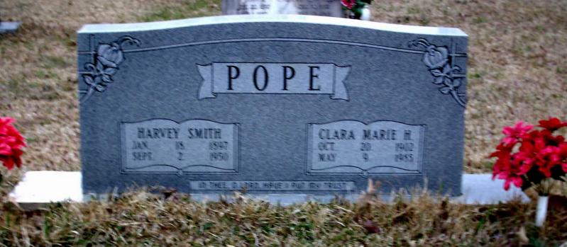 | Pope, Clara Marie H. | 10-20-1902 | 5-9-1985 | Double Stone with Harvey Smith Pope "IN THEE OH LORD HAVE I PUT MY TRUST" [Full Last name Hamilton] | NJ |