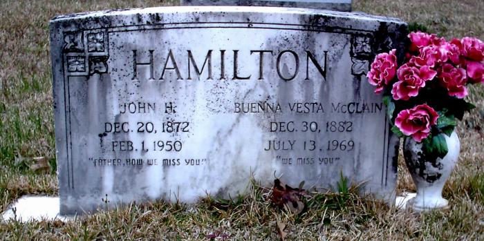 | Hamilton, John H. | 12-20-1872 | 2-01-1950 | Double Stone with Buenna Vesta McClain Hamilton "FATHER, HOW WE MISS YOU." | NJ |