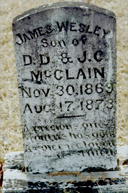 | McClain, James Wesley | Nov 30, 1869 | Aug 17, 1873 | "Son of D. D. & J. C. McCLAIN" "A precious one from us has gone, A voice we loved is stilled." | PC |