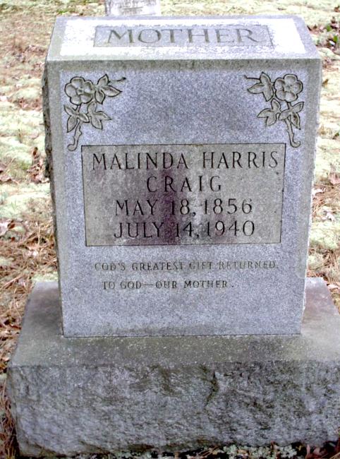 | Craig, Malinda Harris | 5-18-1856 | 7-14-1940 | "MOTHER" "GOD'S GREATEST GIFT RETURNED TO GOD - OUR MOTHER" | NJ |