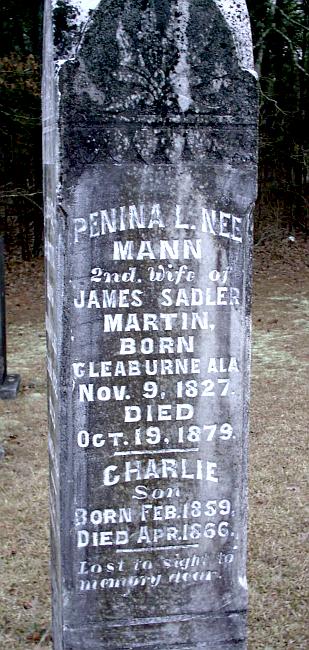 | Martin, Penina L. nee Mann | 11-09-1827 | 10-19-1879 | "2nd Wife of JAMES SADLER MARTIN" "BORN CLEABURNE, ALA." Tall slender stone has four names on it: James Sadler Martin and his two wives and son. | NJ |