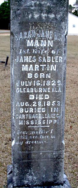 | Martin, Sarah Jane nee Mann | 7-16-1829 | 8-28-1853 | "1st Wife of JAMES SADLER MARTIN" "BORN CLEABURNE ALA." "BURIED IN CARTHAGE LEAKE Co. MISSISSIPPI" "Dear mother I still see thee in my dreams." Tall slender stone has four names on it: James Sadler Martin and his two wives and son. | NJ |