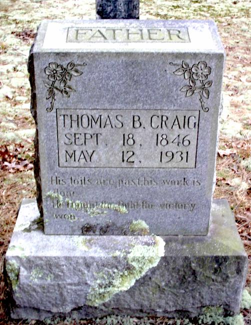 | Craig, Thomas B. | 9-18-1846 | 5-12-1931 | "FATHER" "His toils are past, his work is done. He fought the fight, the victory won." | NJ |