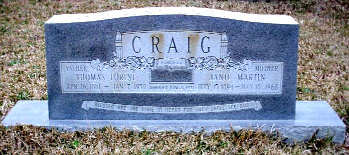 | Craig, Thomas Forest | 4-16-1881 | 1-7-1959 | Double Stone with Janie Martin Craig "PSALM 23" "FATHER" "MARRIED NOV. 21, 1921" "BLESSED ARE THE PURE IN HEART FOR THEY SHALL SEE GOD" | NJ |