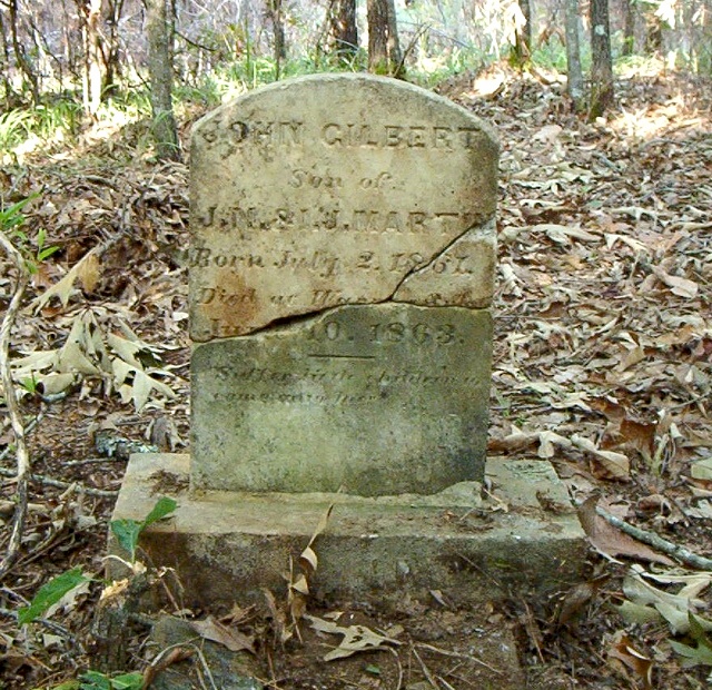 | Martin, John Gilbert - NEW PHOTO 10-31-2005 | July 2, 1861 | June 10, 1863 | "Son of J. N. & I. J. [Scobey] Martin" "Died at Warren, Ark." "Suffer little children to come unto Him" Part of stone is missing. Another view of his headstone | JS |
