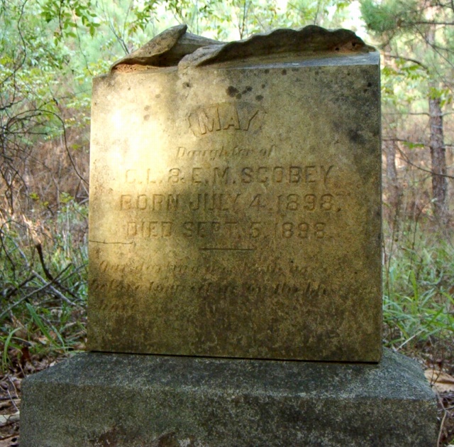 | Scobey, Mae - NEW PHOTO 10-31-2005 | July 4, 1898 | Aug. 5, 1898 | "Daughter of C. L. [Charles] & E. M. [Eddie Mae] Scobey" Another view of her headstone | JS |