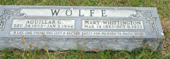 | Wolfe, Aquillar G. | December 24, 1863 | January 3, 1944 | Double Stone with Mary Whittington Wolfe "A LIFE LIKE THEIRS HAS LEFT A RECORD SWEET FOR MEMORY TO DWELL UPON" [Full Name: Aquillar Greer Wolfe; h/o Mary J. (Whittington) Wolfe; s/o Hillard V. and Jane Greer Wolfe; f/o Ollie Jane Wolfe Morgan Atkins] | BB & DG |