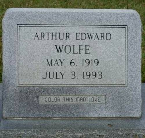| Wolfe, Arthur Edward | May 06, 1919 | July 3, 1993 | “COLOR THIS MAN LOVE” [s/o Charles Henry & Euna Blanche Franklin Wolfe] | BB & DG |