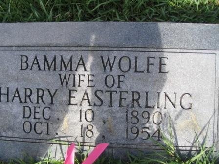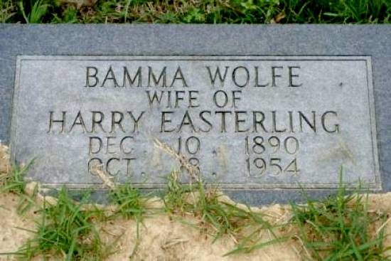 | Easterling, Bamma Wolfe | 10 Dec 1890 | 18 Oct 1954 | "WIFE OF HARRY EASTERLING" Close-up Photo [Full Name; Bamma Wolfe Easterling, w/o J. Harry Easterling, d/o James Hilliard & Sina Cecilia Wagnon Wolfe; m/o Troy, Sinnie, Ruby, James W. & Louise] | BB & DG |
