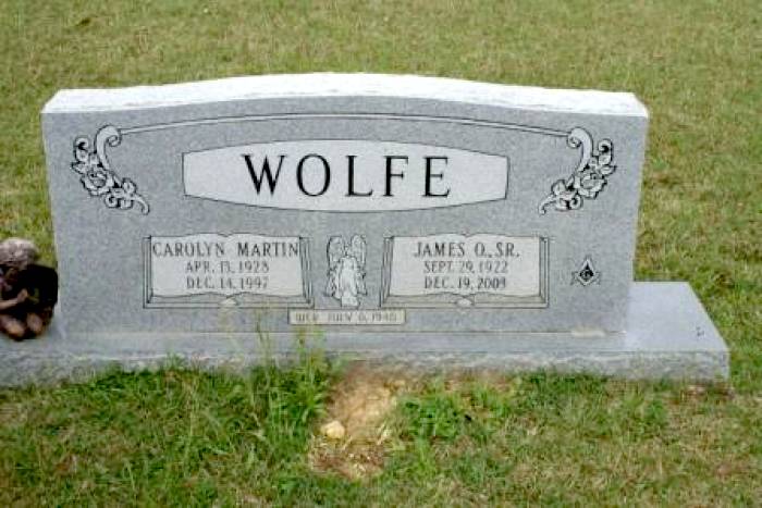 | Wolfe, Carolyn Martin | April 13, 1928 | December 14, 1997 | Double Stone with James O. Wolfe, Sr. “WED JULY 6, 1946” Angel emblem [w/o James O. Wolfe, Sr.] | BB & DG |