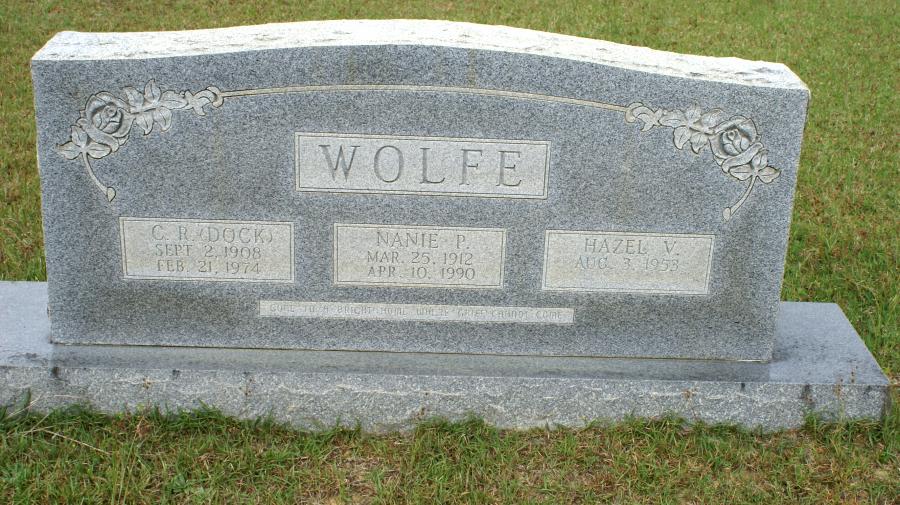| Wolfe, C. R. [Cordie Ray] (Dock) | September 2, 1908 | February 21, 1974 | Triple Stone with wife, Nanie P,. & Hazel V. Wolfe “GONE TO A BRIGHT HOME WHERE GRIEF CANNOT COME" | BB & DG |
