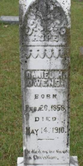 | Owens, Daniel H. | February 20, 1958 | May 14, 1910 | "He died as he lived - a Christian.” [h/o Malissa A. Owens] | BB & DG |