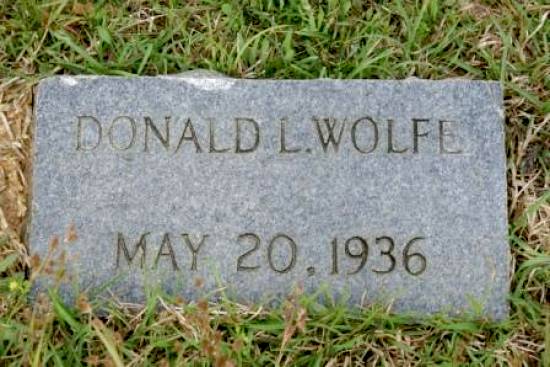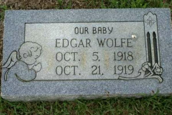 | Wolfe, Edgar | October 05, 1918 | October 21, 1919 | "OUR BABY" [Full Name: Edgar Wolfe, s/o Hillard Nash & Leona Trantham Wolfe; b/o Thaddias, Jim Jay, Floy & Beatrice Wolfe] | BB |