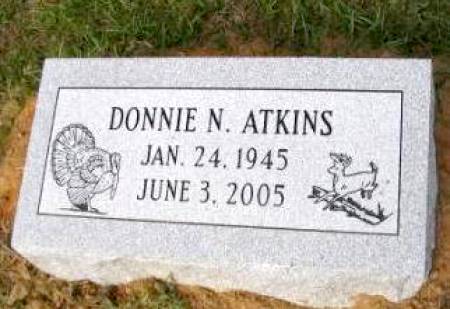 | Atkins, Donnie N. | January 24, 1945 | June 3, 2005 | Stone has turkey and bear emblems [ Full name: Donnie Ned Atkins; s/o Carl & Clemmie Reddin Atkins; brother of Vernon, Billie, James Lewis Atkins & Martha Ann Atkins Gardner] | BB & DG |