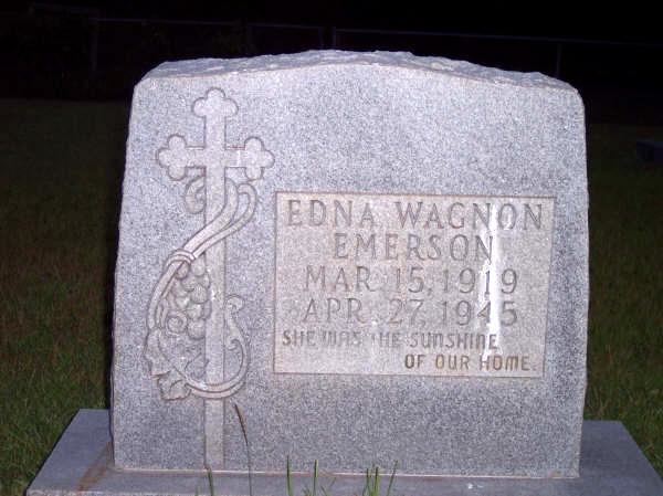 | Emerson, Edna Wagnon | 15 Mar 1919 | 27 Apr 1945 | "SHE WAS THE SUNSHINE OF OUR HOME" [nee Edna Winford Wagnon; d/o William Thomas Wagnon & Cumi Rilla Richardson; w/o John R. "Rich" Emerson, m/o Jackie Neal Sr. and Billy Joe Emerson, Mary Lee Gray Turner and Willie Muriel "Kate" Mercer] | CB & JG |