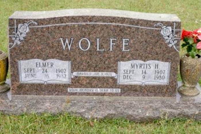 | Wolfe, Elmer | September 24, 1902 | June 26, 1982 | Double Stone with Myrtis H. Wolfe "MARRIED JAN. 3, 1926” “YOUR MEMORY IS DEAR TO US” [s/o John Lewis & Minnie Lee Bell Wolfe] | BB & DG |