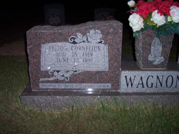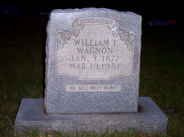 | Wagnon, William T. [Thomas] | 3 January 1877 | 19 March 1951 | "WE WILL MEET AGAIN" [s/o Peter Roderick Wagnon & Tennessee Whitehead Nabors; h/o Cumi Rilla Richardson Wagnon; f/o Ray, Roy, Tommy, William Floyd, Jack, Buris, Lewie Earl, Tennie Emily and Lela Wagnon, and Linnie Florine Emerson, & Edna Winford Emerson] | BB & JG |