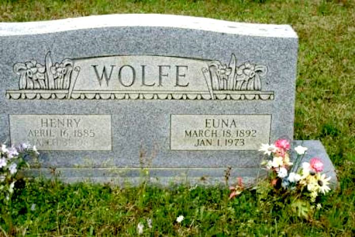 | Wolfe, Euna | March 18, 1892 | January 1, 1973 | Double Stone with Henry Wolfe [Full Name: Euna Blanche Franklin Wolfe; w/o Charles Henry Wolfe; d/o William A. & Martha Hannah Mosley Franklin; m/o Charles Henry, Robert Terril, Perry Burton, Madge, Betty Joe, Eva Jeanette, Howard Lee, Arthur Edward, Lois Marie & Jimmy Franklin] | BB & DG |