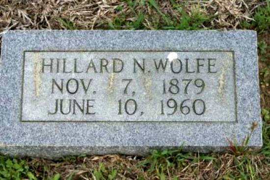 | Wolfe, Hillard N. | November 7, 1879 | June 10, 1960 | [Full Name: Hillard Nash Wolfe; h/o Leona Trantham (m.1902) & Freddie Hamaker (m. 1915); s/o Aquilla Greer & Mary Jane Whittington Wolfe; f/o Thaddias, Jim Jay, Floy, Beatrice & Edgar Wolfe] | BB & DG |