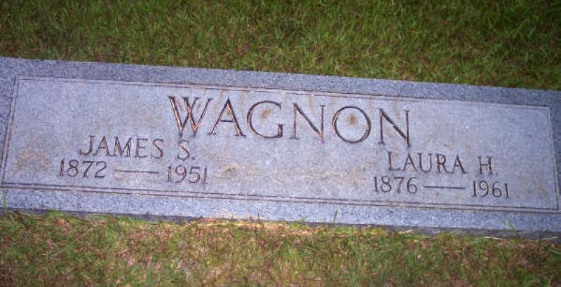 | Wagnon, Laura H. [Hanna] | 1876 | 1961 | Double Stone with James S. Wagnon [w/o James Stanford Wagnon; m/o (sons) James, Hobart, Herbert, Herman, Huey, & Lindle Faye Wagnon; (daughters) Ila Jean, Pearl I., Nettie C. Lucile, & Nancy Wagnon] | BB & JG |