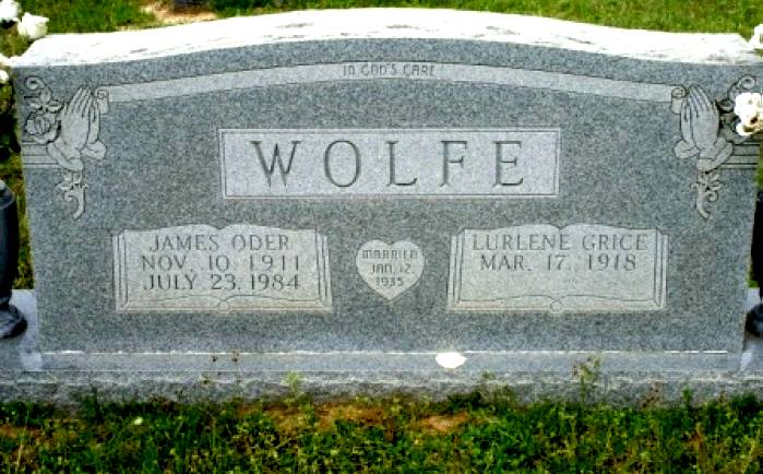 | Wolfe, James Oder | November 10, 1911 | July 23, 1984 | Double Stone with Lurlene Grice Wolfe “MARRIED JAN 12, 1935” “IN GOD'S CARE” [Full Name: James Oder Wolfe; h/o Lurlene Grice Wolfe; s/o James Vastine & Mae Belle Derryberr) Wolfe] | BB & DG |