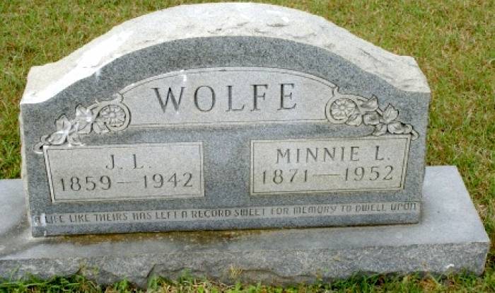 | Wolfe, J. L. | 1859 | 1942 | Double Stone with Minnie L. Wolfe "A LIFE LIKE THEIRS HAS LEFT A RECORD SWEET FOR MEMORY TO DWELL UPON" [Full Name: John Lewis Wolfe, h/o Minnie L. Bell Wolfe; s/o Hilliard Vastine Wolfe &Jane Lou Greer Wolfe; f/o William, Byrdie, Effie Mae, John Lewis, Velma, Elmer & Cordie Ray] | BB & DG |