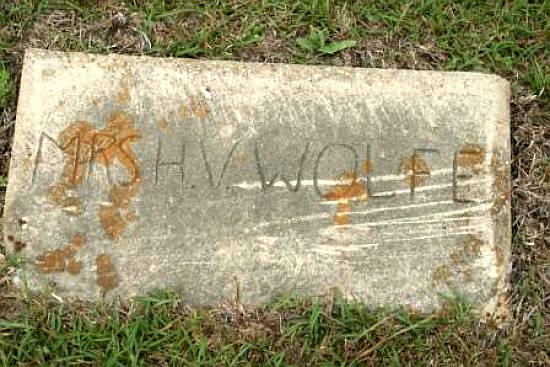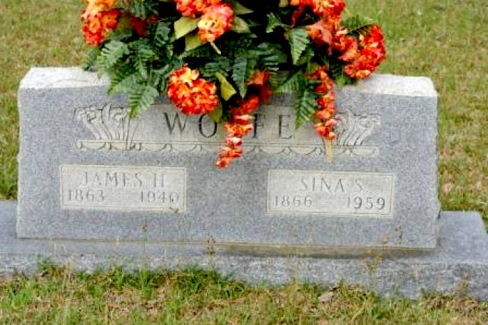 | Wolfe, Sina S. | 1866 | 1959 | Double Stone with James H. Wolfe [Full Name: Sina Cecilia Wagnon Wolfe; middle name could be “Sissilee;" w/o James Hilliard Wolfe; d/o John Rodrick & Nancy Jane Wooten Wagnon; m/o Jessie Lloyd Wolfe, Emma Essie “Bamma” Wolfe Easterling, John Vastine Wolfe & Lettie Gertis Wolfe Joyner] | BB & DG |