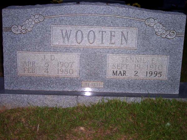 | Wooten, J. D. | Apr. 5, 1907 | Feb. 4, 1980 | Double Stone with Tennie E. Wooten "AT REST" [h/o Tennie Emily Wagnon Wooten] | JG |