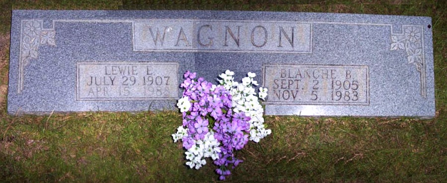 | Wagnon, Lewie E. | 29 Jul 1907 | 15 Apr 1988 | Double Stone with Blanche B. Wagnon [middle name Earl; s/o William Thomas Wagnon & Cumi Rilla Richardson; h/o Blanche B. Martindale; f/o Annie Ruth & Lillian M. Wagnon] | BB & JG |