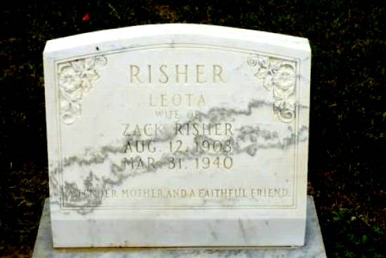 | Risher, Leota | August 12, 1903 | March 31, 1940 | “WIFE OF ZACK RISHER” “A TENDER MOTHER AND A FAITHFUL FRIEND” [d/o Daniel L.& Martha Frances Atkins] | BB |