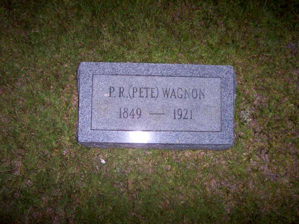 | Wagnon, P. R. (Pete) | 1849 | 1921 | [s/o John Roderick Wagnon & Nancy Jane Wooten.; h/o Tennesse Whitehead Nabors; f/o Elizabeth J. Horton, James Stanford, William Thomas, Cora B., John R., Forence S. Henry, Molly Obrion, Carroll D., Joseph Earl, Sr. & 2 infants Wagnon that died at birth or an early age] | JG |