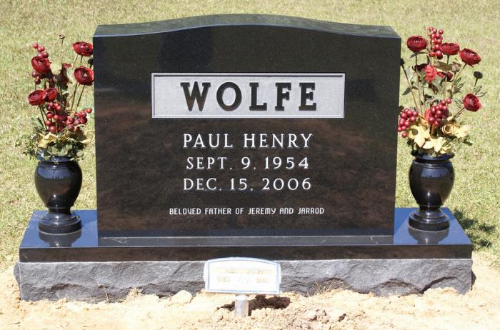 | Wolfe, Paul Henry | 9-9-1954 | 12-15-2006 | "BELOVED FATHER OF JEREMY AND JARROD" [s/o Howard Lee & Ivy Wagnon Wolfe; father to Jeremy Paul & Jarrod Scott Wolfe] | JW |