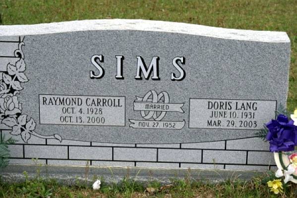 | Sims, Doris Lang | June 10, 1931 | March 29, 2003 | Double Stone with Raymond Carroll Sims "MARRIED NOV 27, 1952" [w/o Raymond Carroll Sims] | BB & DG |
