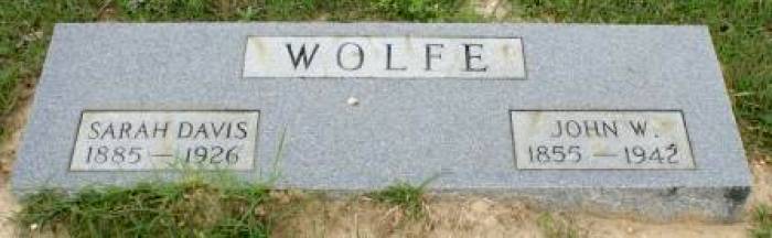 | Wolfe, Sarah Davis | 1885 | 1926 | Double Stone with John W. Wolfe [Full Name: Sarah M. Davis, w/o John Wiley Wolfe; m/o Gladys, Ethel, Molly, Essie, Liz, Will, Rosie, George, Jean & John W] | BB & DG |