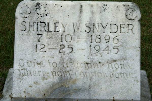 | Snyder, Shirley W. | 7-10-1896 | 12-25-1945 | "Gone to a bright home Where pain cannot come"[h/o Lillian Atkins Snyder] | BB & DG |