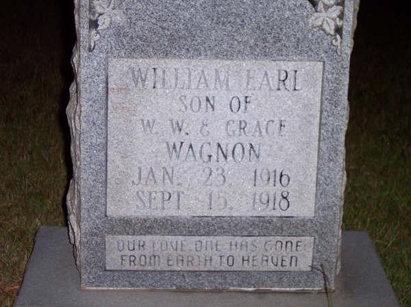 | Wagnon, William Earl - NEW WITH PHOTO 1-23-2009 | 23 Jan 1916 | 15 Sept 1918 | "SON OF W.W. & GRACE WAGNON" "OUR LOVE ONE HAS GONE FROM EARTH TO HEAVEN" [s/o Rev. William Wiley Wagnon and Grace Pearl Hamaker] | JG |