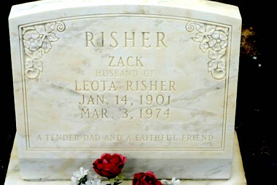 | Risher, Zack | January 14, 1901 | March 3,1974 | "HUSBAND OF LEOTA RISHER" "A TENDER DAD AND A FAITHFUL FRIEND" [Full name: Quincy Zack Risher; s/oWalter Basil & Temperance Caroline Rice Risher; h/o Leota Atkins Risher; f/o Charles, Dan Lee, Elvie, Elsie, Wilburn & Gracie Risher] | BB & DG |
