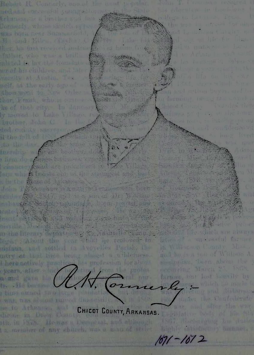Robert H. Connerly, one of the most popular, learned and successful young attorneys in the State of Arkansas, is a brother and law partner of John C. Connerly, whose sketch appears in this history. He was born near Summerfield, Ala., the son of D. C. B. and Ellen (Taylor) Connerly. Like his brother, he first received instructions at home from his father, who was a brilliant scholar and well calculated to lay the foundation for the successful career of his children, and later Robert entered the University at Austin, Tex., commencing life for himself, at the early age of nineteen, as a farmer. He then went to New Orleans, and was with his brother, Frank, who is connected with the Granite works of that city. In January, 1886, Mr. Connerly moved to Lake Village, reading law under his brother, John C. In the fall of 1880, he was elected county surveyor, an office which he held until the fall of 1888, at which time he was admitted to the bar, and the same year entered into a partnership with his brother, John C. Connerly. The firm do a large business, especially real estate and chancery, and are prominent in Lake Village, a place which boasts one of the strongest and best bars in the State of Arkansas.