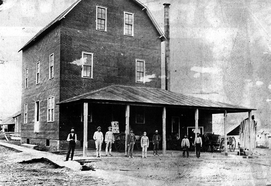 "Employees of the mill are unidentified but Mrs. Dewey Ousnamer, who contributed the picture, is almost certain that her father, Henry Burgess, is the mustached gentleman standing on the sidewalk."