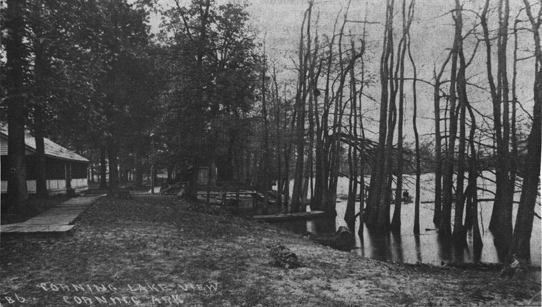 "Corning Lake was just the right distance from town to make it the terminal of Sunday afternoon strolls. The building is the men’s club house of the Knobel Fishing Club, an organization of St. Louis anglers who got away from it all by a train ride to Corning."