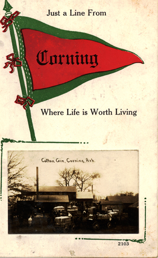 Postcard of the Cotton Gin, Corning, AR, postmarked Corning, ARK,