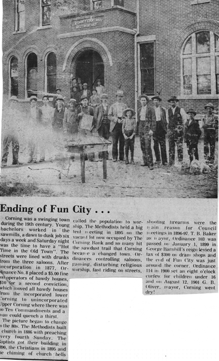 "The picture began to change in the 80s. The Methodists build [sic] a church in 1886 with preaching every fourth Sunday. The Baptists got a building in 1890, the Christians in 1895 and the chiming of church bells called the population to worship. The Methodists held a big tent meeting in 1895 on the vacant lot now occupied by The Corning Bank and so many hit the sawdust trail that Corning became a changed town. Ordinances controlling saloons, gaming, disturbing religious worship, fast riding on the streets, shooting fire arms were the main reason for council meetings in 1896;97 during the T. B. Baker term as mayor, Ordinance 103 passed on January 1, 1899 in George Barnhill's reign levied a tax of 300 on dram shops and the end of Fun City was just around the corner. Ordinance 114 in 1900 set an eight o'clock curfew for kids uner [sic] 16 and on August 12, 1901 G. B. Oliver, mayor, Corning went dry!