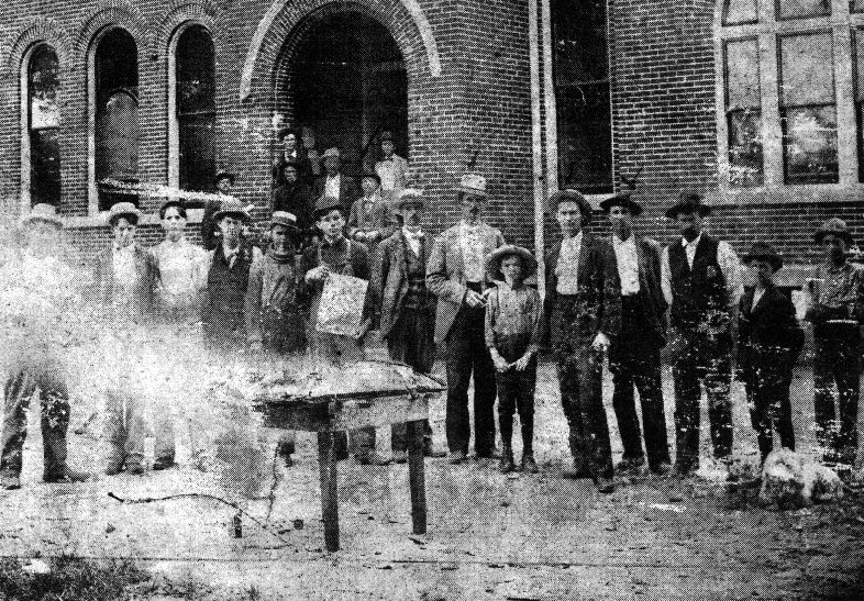 "This L. D. Oaks photograph made in front of the new brick courthouse pictures the last act, the gambling den had been raided and the table seized for burning. From left to right, J. W. Harb, circuit clerk, is standing on the court house [sic] steps. J. N. Moore, Usher Wells, and W. G. Smith, deputy sheriff who made the raid. Anyone knowing W. G.'s son, Floyd, will know the family resemblance. On the extreme left is the white frame courthouse that served the Western District from 1881 until 1900. It was sold to Joseph Dudgeon after the Dudgeon Hotel burned in 1901 and was moved to Chestnut and Second to become a four apartment dwelling!